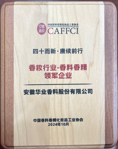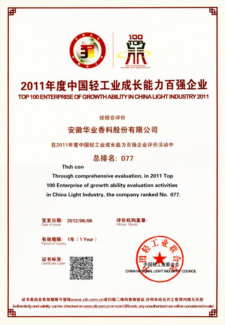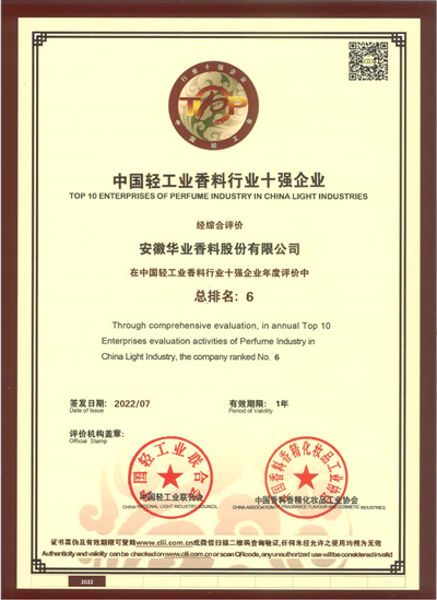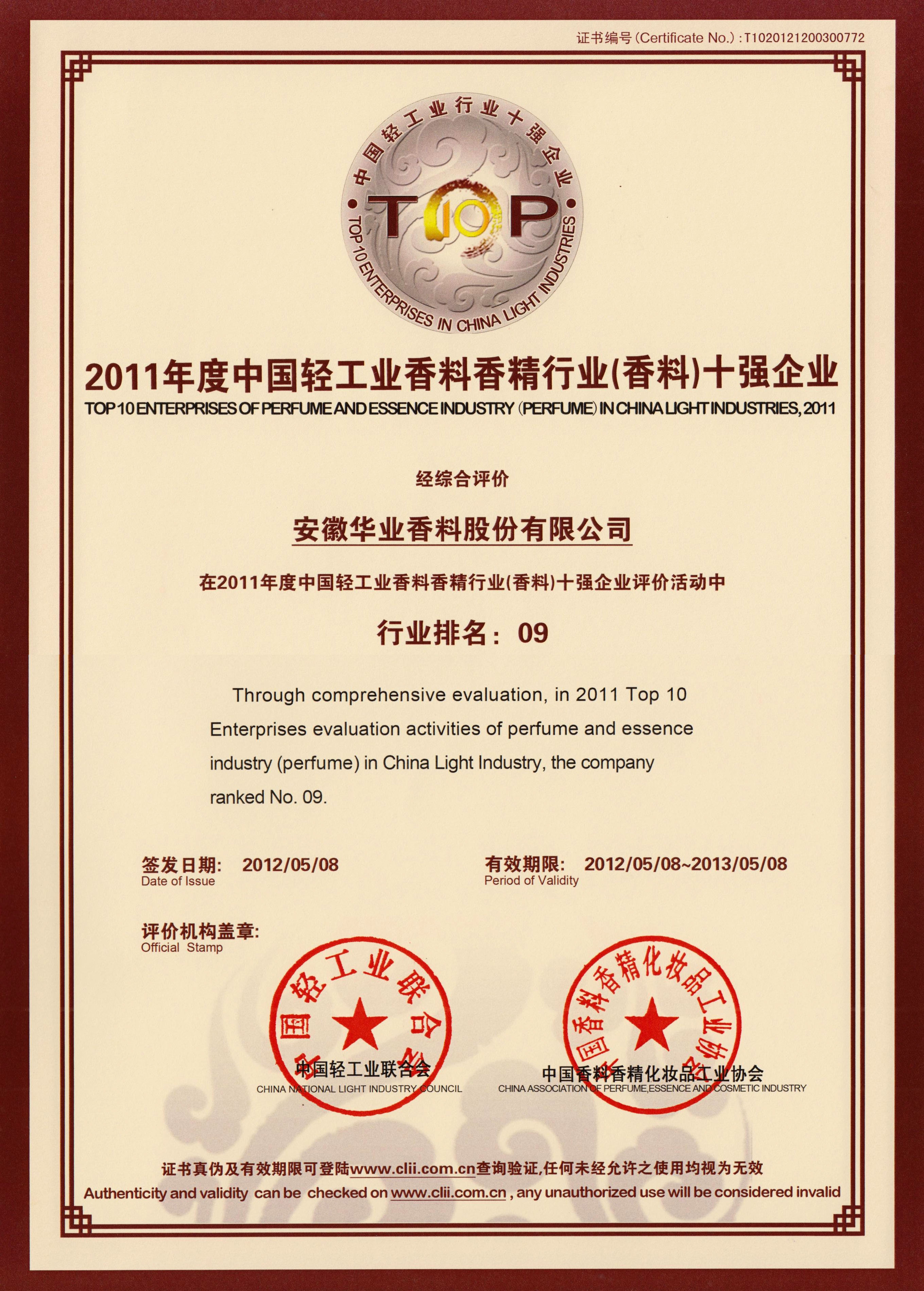 2011年荣获中国轻工业香料香精行业(香料)十强企业