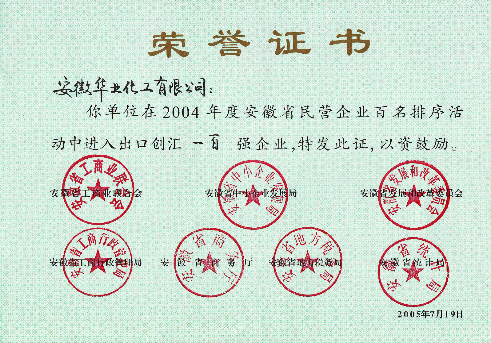 2004年丙位内酯首次出口国际市场,并获安徽省民营企业出口创汇100强