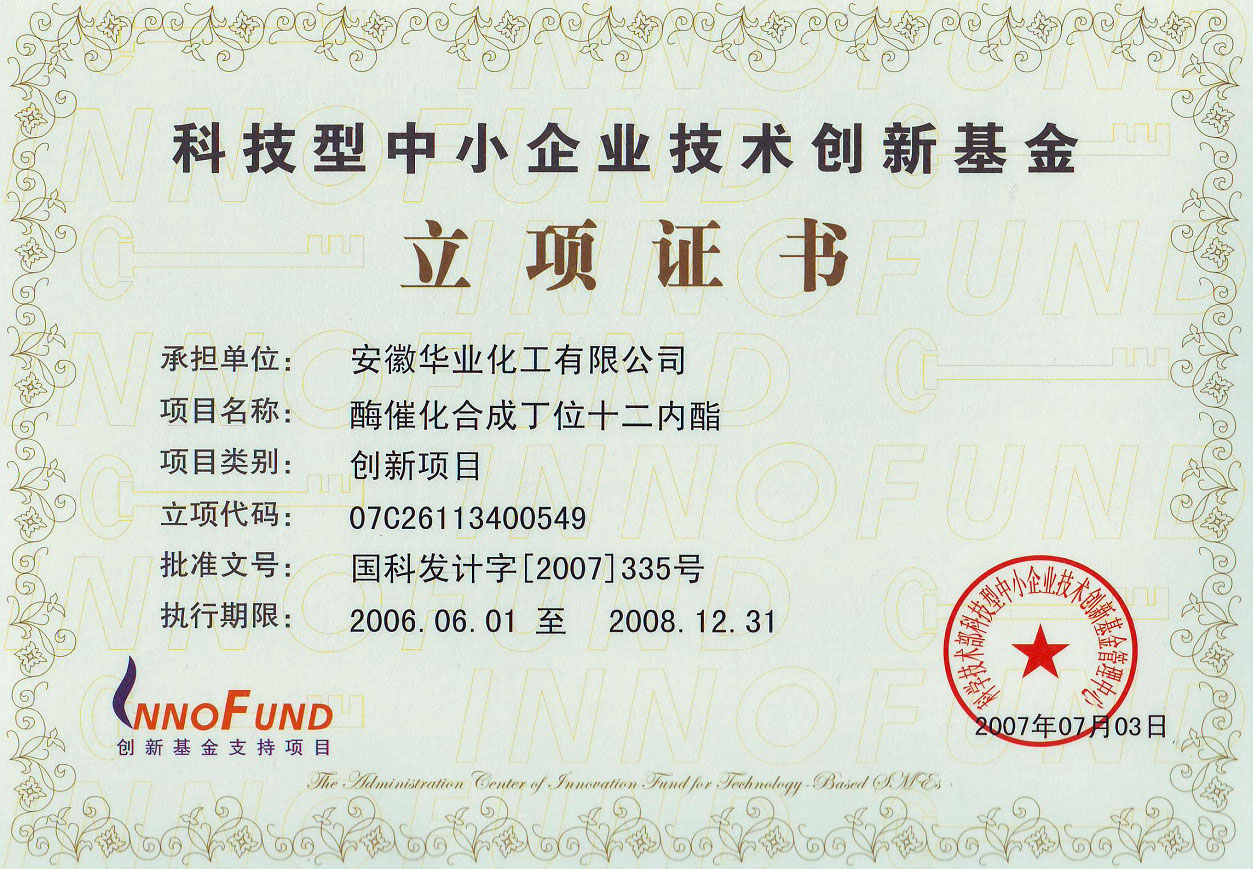 2006年”酶催化合成丁位十二内酯项目获“科技型中小企业技术创新基金立项,列入安徽省”861“行动计划项目