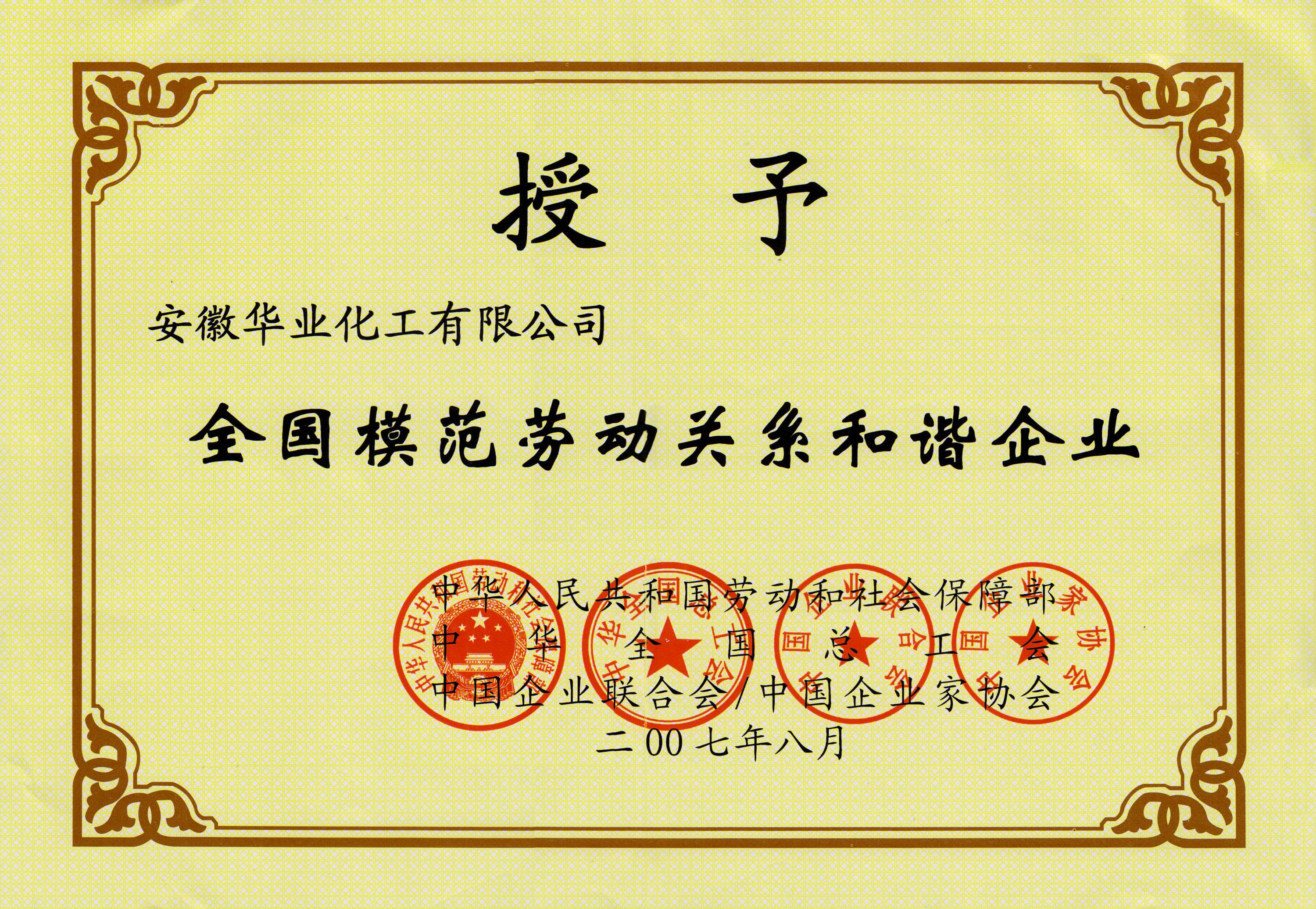 2007年8月荣获全国模范劳动关系和谐企业