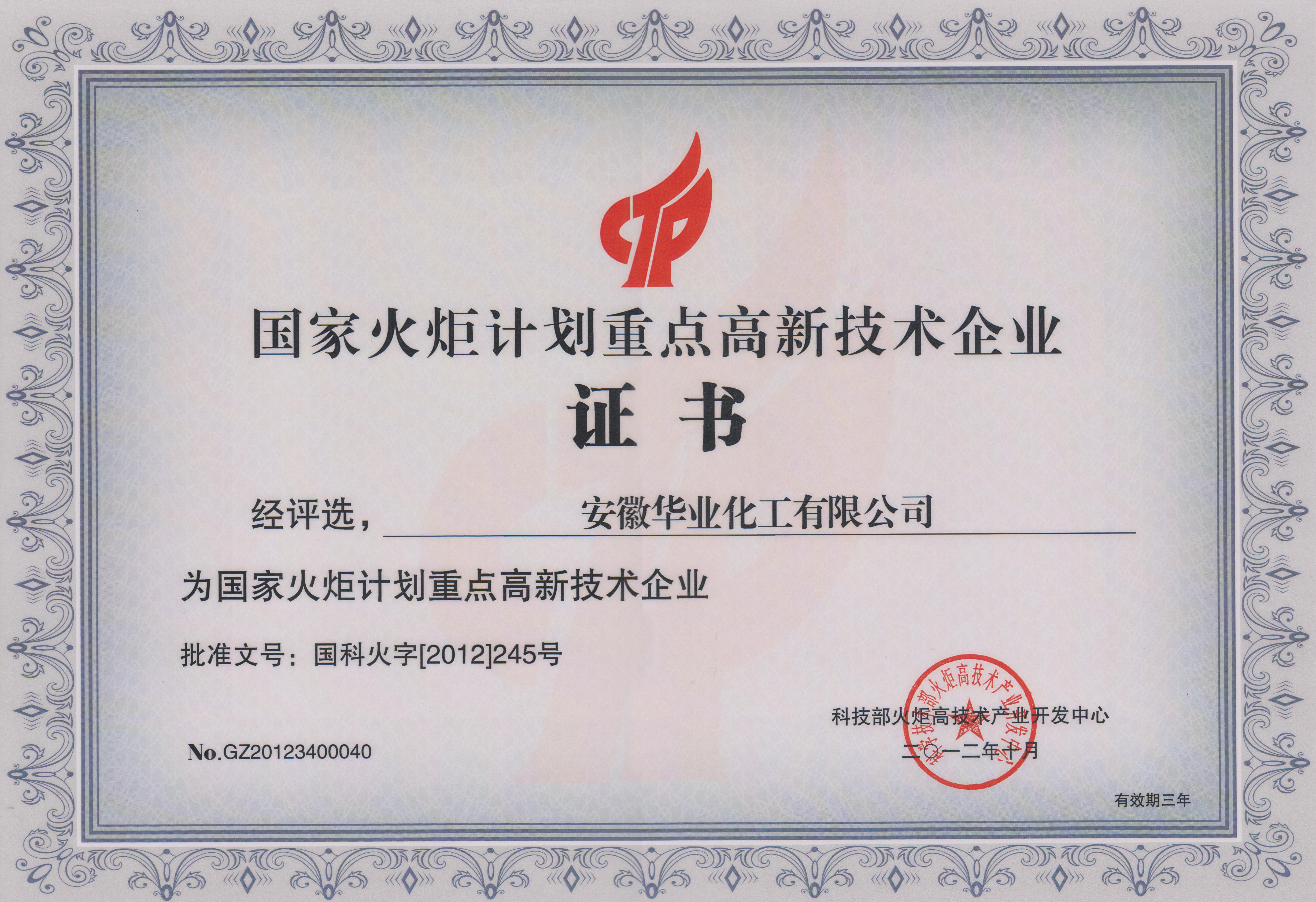 2013年丁位内酯项目被认定为国家火炬计划重点高新技术企业