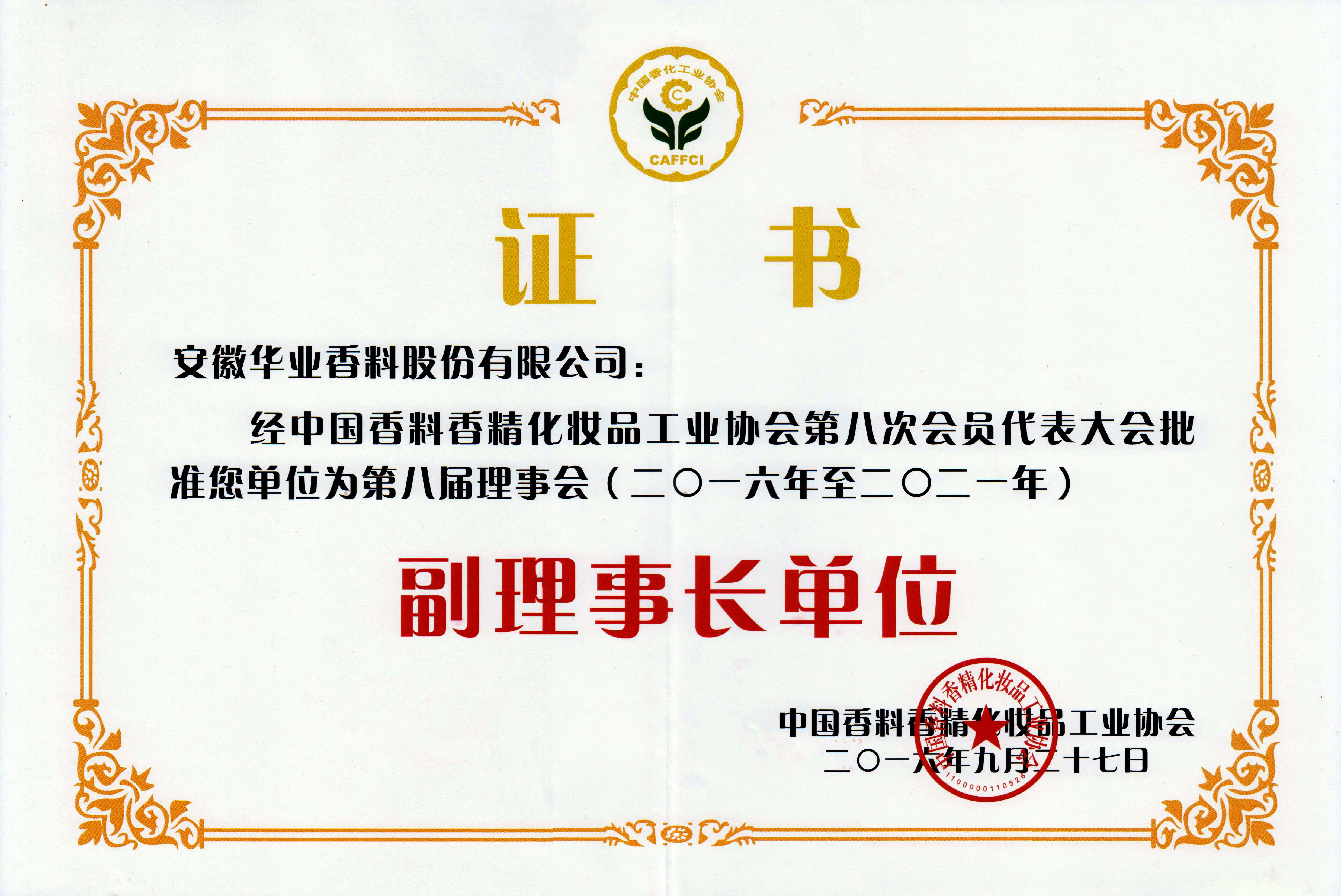 2016年当选中国香料香精化妆品工业协会副理事长单位