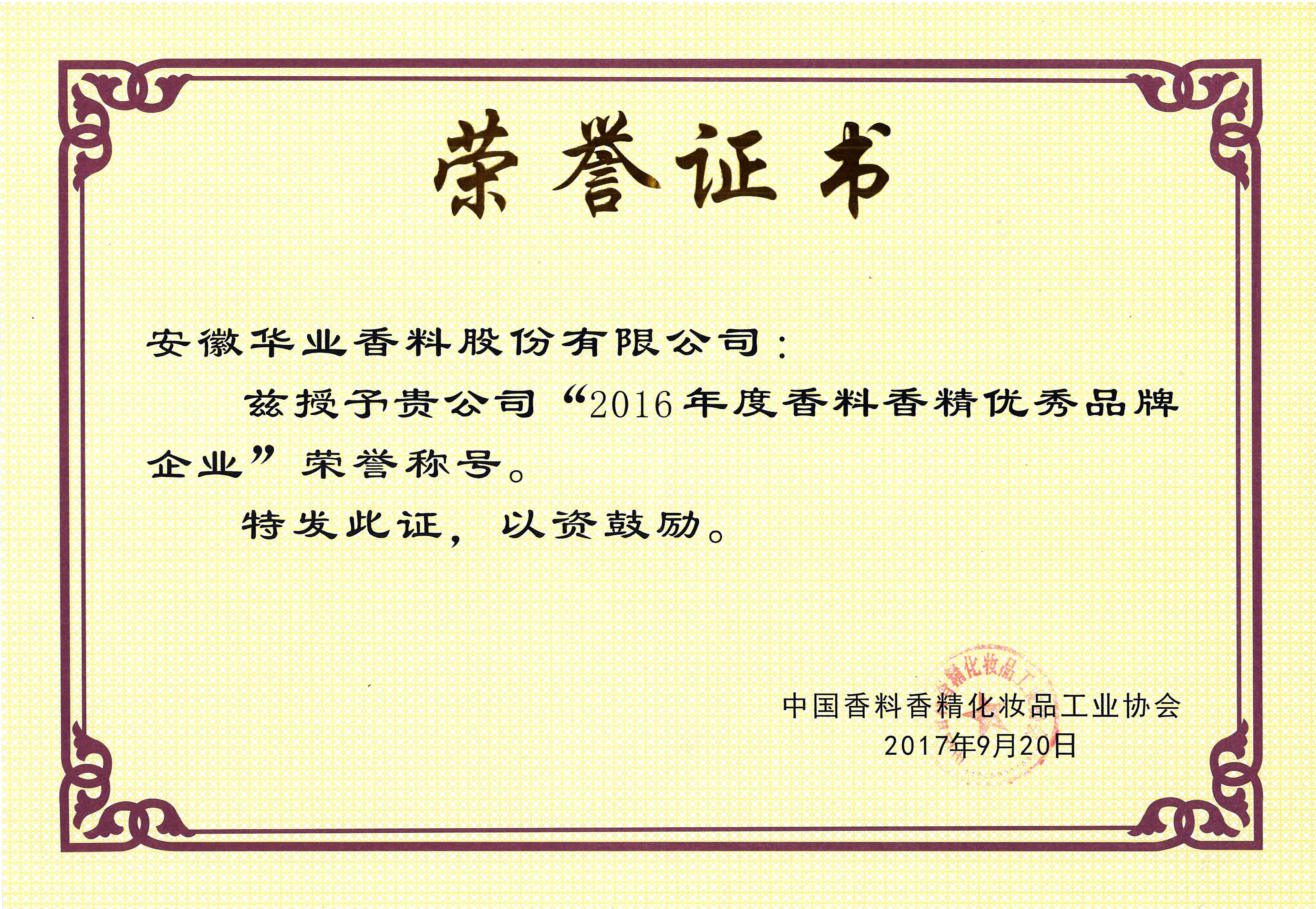 2017年获评“2016年度香料香精优秀品牌企业”
